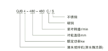 以“QJB4—480—480 C / S”為例,“QJB”潛水攪拌機(潛水推流器);“480”表示額定功率KW;“480”表示葉輪直徑mm;“C”“S”表示材質是“C”表示碳鋼“S”表示不銹鋼。
