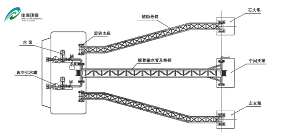 3. 輔助搖臂式浮動泵站:水位落差≤20m風力較大,船體不適合拋錨定位的情況下,采用主輔架旋臂定位。增強了系統的穩定性和適應性。當水位快速變化或水流沖擊力較大時,輔助搖臂可分擔部分壓力,確保輸水管與取水口的可靠連接,提高取水的穩定性和可靠性,適用于水位落差大且水流復雜的水域。