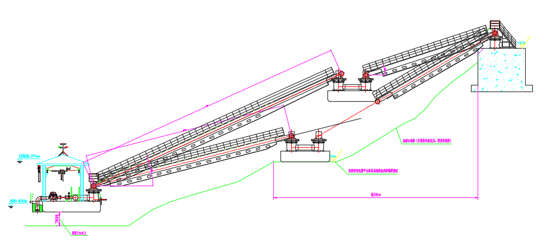 2. 高落差單級搖臂式固定泵站:適用于取水點水位落差20m~30m較大的,取水點距離岸邊支墩距離 ≤50m的,人行走道雙級懸橋式安裝場景。其特點是通過單級搖臂連接輸水管,結構相對簡單,能適應較大的水位變化幅度。但對搖臂的強度和穩定性要求高,可在落差較大且水流相對平穩的江河取水,通過調整搖臂角度,保證取水口始終處于合適水位。
