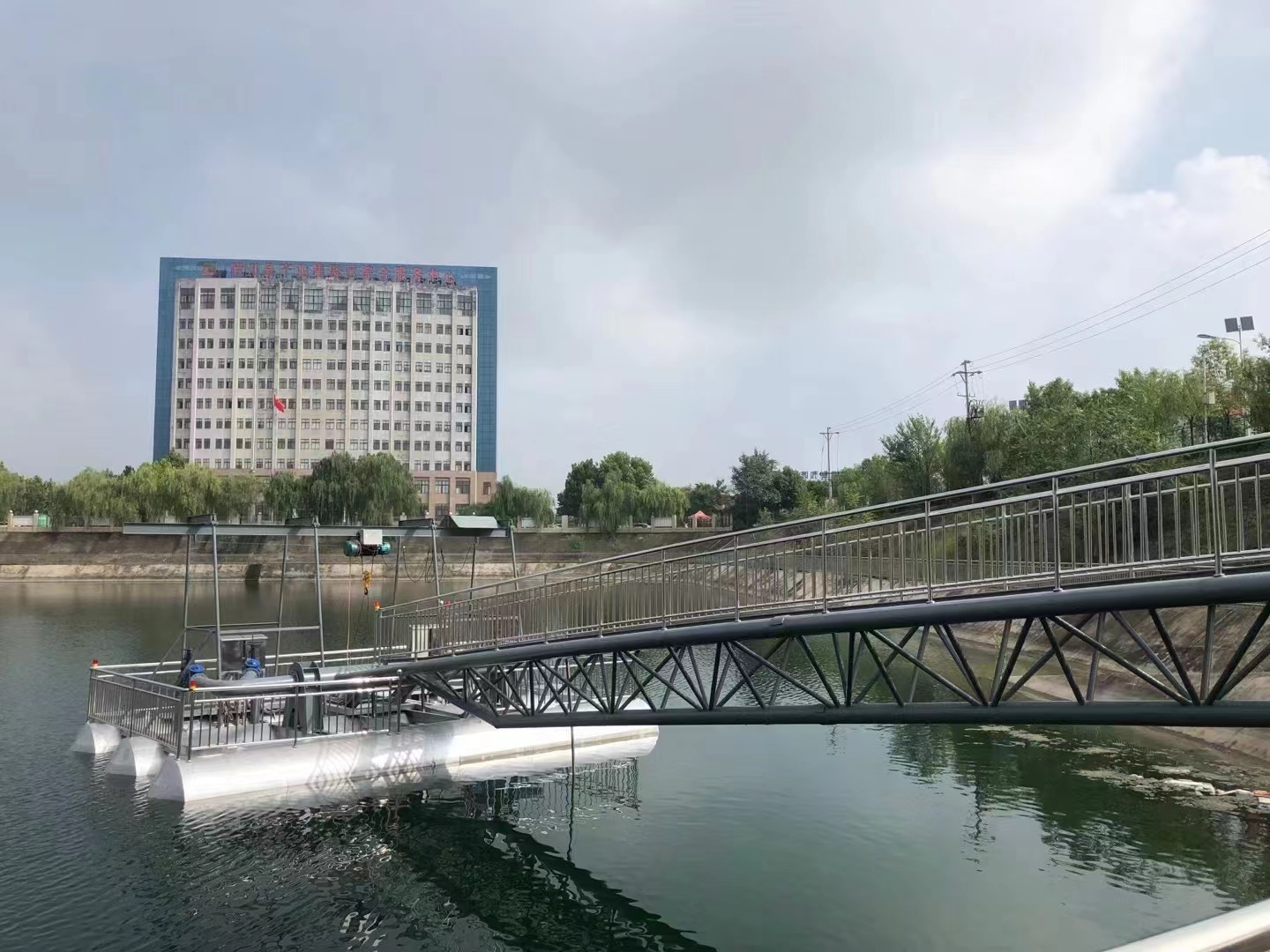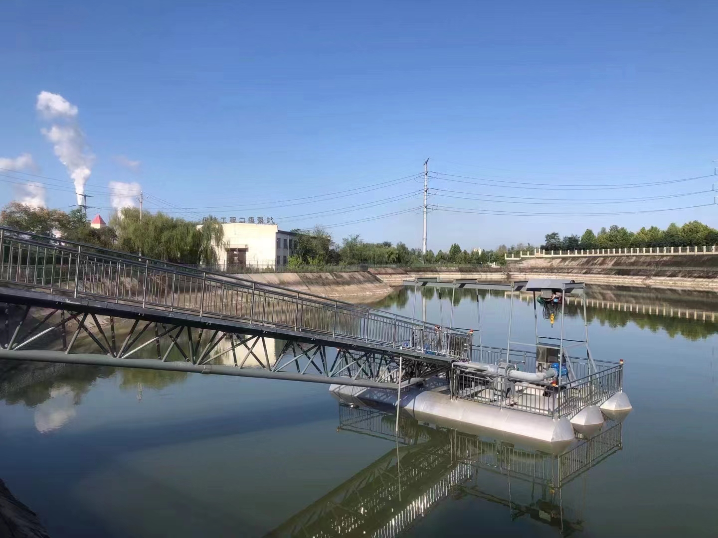 6. 浮橋式泵站:通過浮橋連接岸邊與泵站主體,輸水管鋪設在浮橋上,這種結構穩定性好,主要適用于水位變化頻率低,流速較慢,風速不大,岸坡較平坦的工況。特點,浮橋可起到支撐和導向作用,便于輸水管的布置和維護,同時也方便人員和設備在岸邊與泵站間通行。