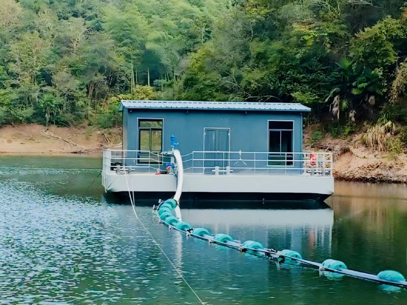 我司直面水域施工的復雜挑戰,肩負提升飲水安全、強化供水能力、助力水廠升級的使命,以“質量過硬、民生為本”的建設理念全力攻堅。此次承建的取水泵船長10米、寬8米、高4.6米,創新采用約40米長水面漂浮式輸水管路,主要由HDPE浮筒+HDPE管路+不銹鋼金屬軟管的取水工藝,整套取水系統可完全漂浮于水面,隨船體及水位升降自動調整,兩端不銹鋼軟管更能適配船體小范圍晃動與搖擺,確保各類水位條件下取水的穩定性與安全性,徹底破解水域取水的環境適配難題。